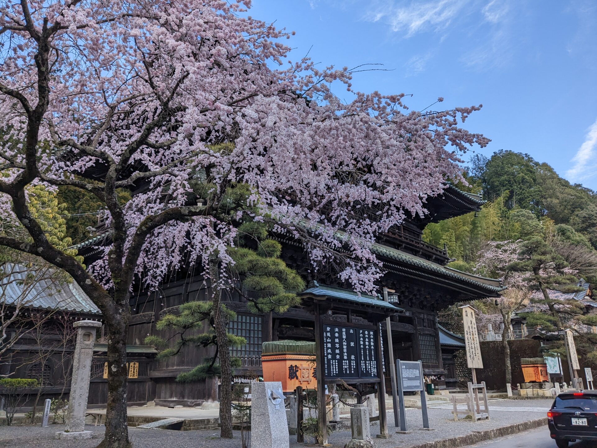 身延山久遠寺のしだれ桜 仏殿前が満開となりました、週末まではたのしませてくれそうです。