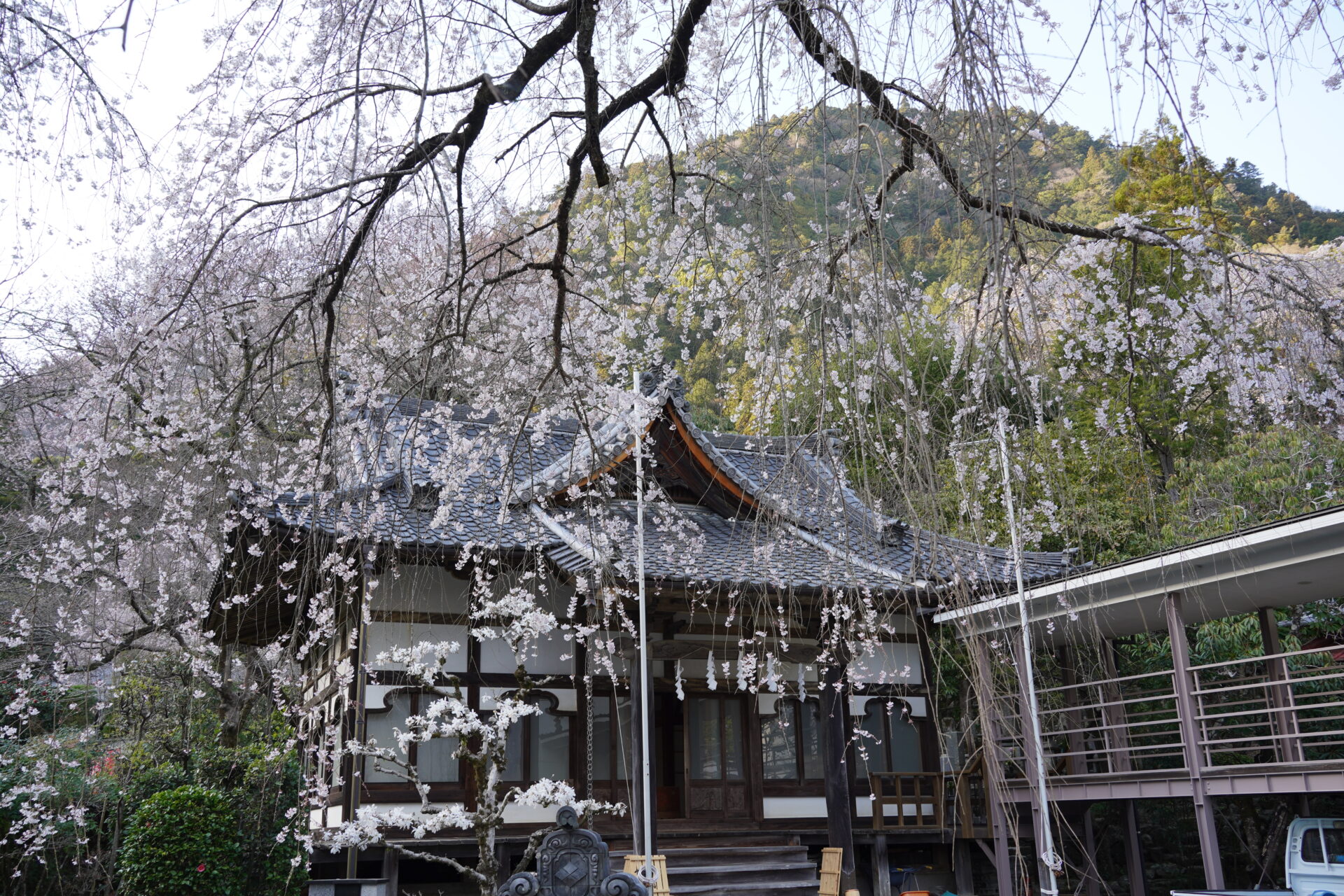 西谷~御廟所周辺のしだれ桜: 本堂のしだれ桜とはまた違う、落ち着いた雰囲気の中で咲く桜が心を癒してくれます。静寂の中で、ゆっくりと花の美しさを堪能できます。