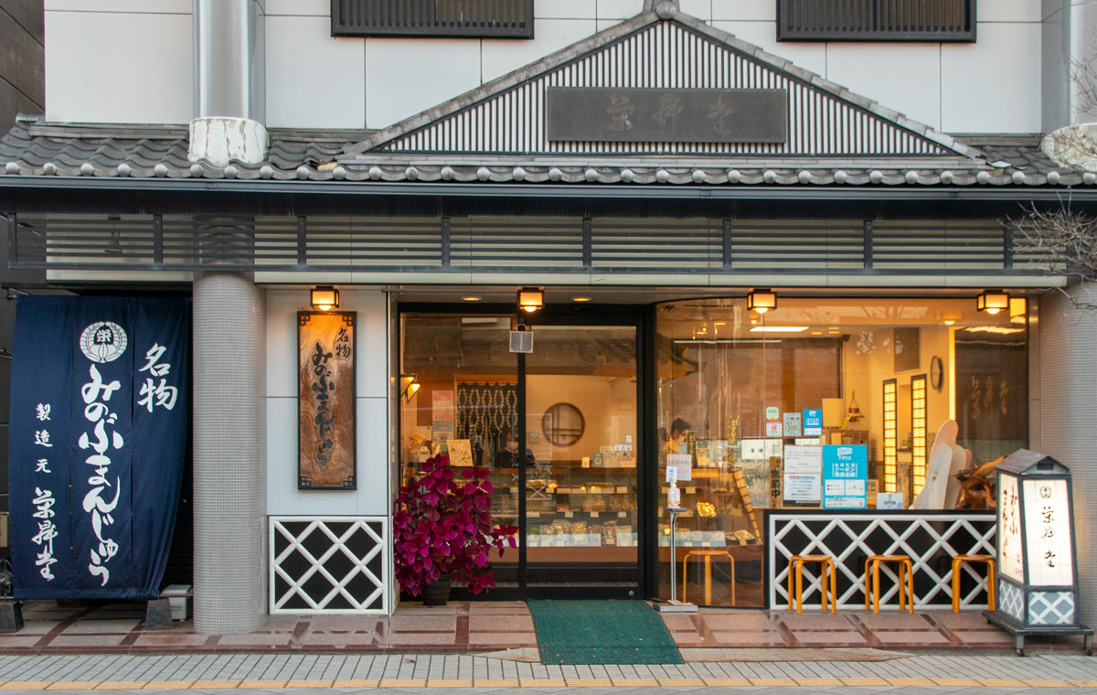 その帰り道、出来立てホヤホヤの「みのぶまんじゅう」を美味しそうに食べています。